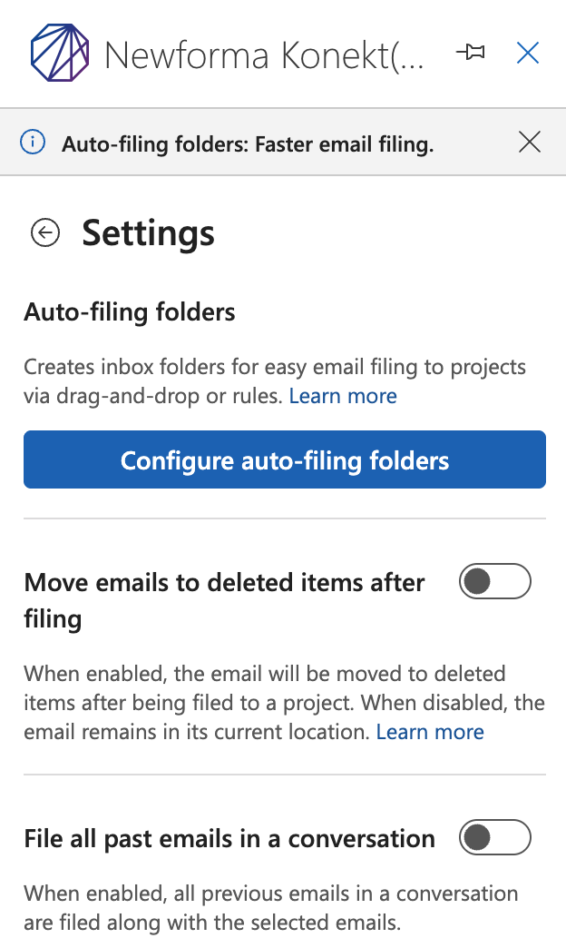 Before you can use auto-filing folders, you must configure them in the Outlook Add-in settings.