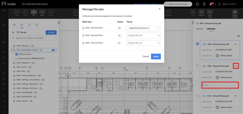 Une fois que les ensembles de fichiers ont été ajoutés, votre équipe peut les utiliser pour organiser les versions des feuilles dans la visionneuse nouvelle génération.