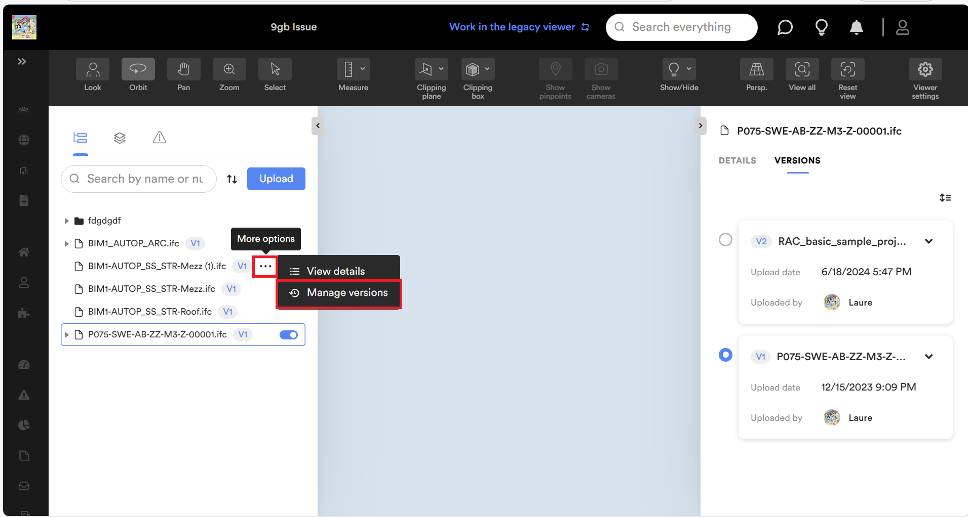 As users update models, it may be necessary for people (BIM coordinators, BIM managers, architects, etc.) to see the changes between different versions of a model. The model version list in the right side panel lets users visualize older versions of models to see the advancement and changes through time.
